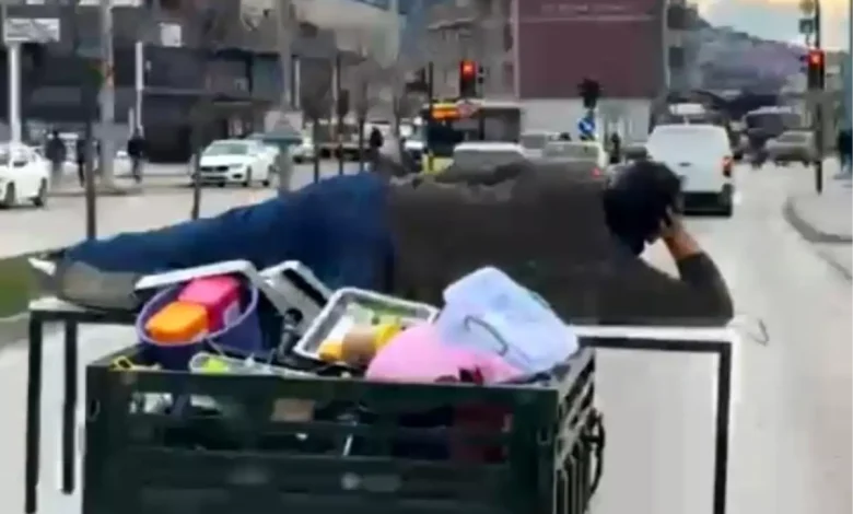 Olay yeri: Osmangazi ilçesi Küçükbalıklı Mahallesi. Motosikletin kasa kısmına yerleştirilen masa üzerinde uzanarak yolculuk yapan bir kişinin görüntüleri kamuya yansıdı.