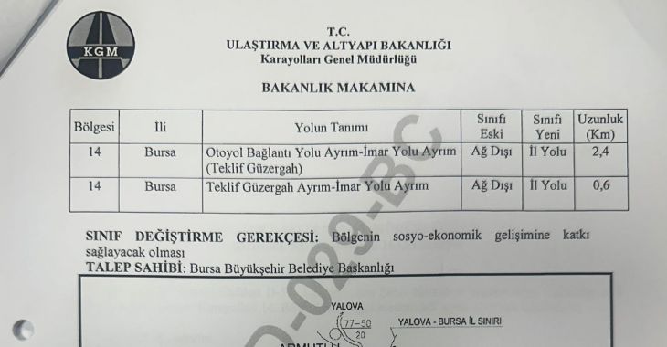 • 07.07.2023 tarihli ve 121197 sayılı yazı ile dönemin Belediye Başkanı tarafından yolun Karayolları ağına alınması resmi olarak talep edilmiştir.