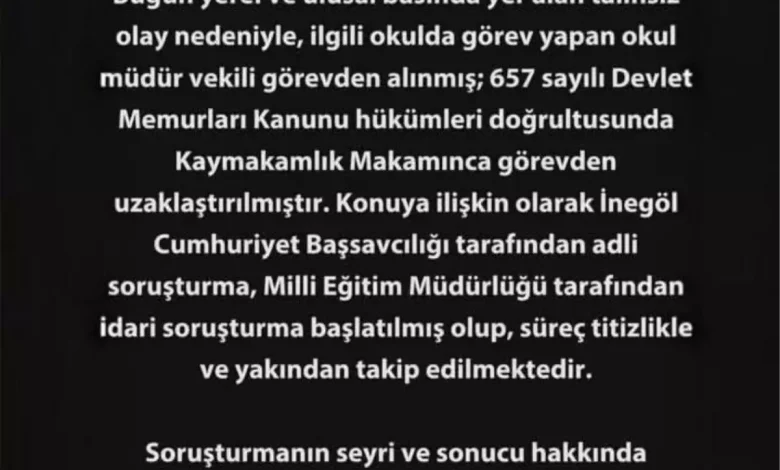 Çalışanlar hakkında yapılan işlemler kapsamında, hakkında idari soruşturma başlatılan müdür vekili görevden uzaklaştırıldı. Konu, 657 sayılı Devlet Memurları Kanunu hükümleri doğrultusunda yönetiliyor. Cumhuriyet Başsavcılığı olayla ilgili adli süreçleri yürütüyor.
